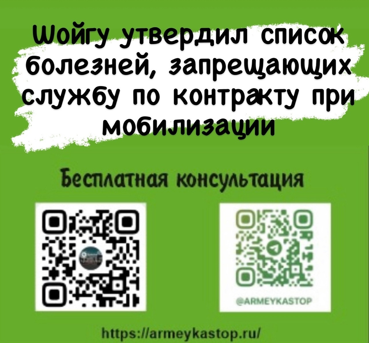 Приказ Министра обороны Российской Федерации от 07.08.2023 № 506"Об утверждении Перечня заболеваний, при наличии которых гражданин (иностранный гражданин), признанный ограниченно годным к военной службе, не может быть принят на военную службу по контракту в Вооруженные Силы Российской Федерации в период мобилизации, в период военного положения и в военное время"(Зарегистрирован 13.09.2023 № 75198)http://publication.pravo.gov.ru/document/000120230913..26 пунктов , препятствующих зачислению на контрактную службу при мобилизации.Передающиеся друг другу1. Вирус иммунодефицита человека (ВИЧ)2. Гепатит В и С3. Активный туберкулез органов дыхания и костейХронические заболевания:- злокачественные опухоли;- болезни сердца, сопровождающиеся сердечной недостаточностью III функционального класса;- гипертония II стадии с артериальной гипертензией II степени при наличии церебральных расстройств;- сахарный диабет I типа;- психические расстройства и нарушения психики из-за употребления психоактивных веществ;- бронхиальная астма средней степени тяжести;- эпилепсия;- пережитые инсульты и их последствия.Последствия травм и слабое зрение:- острота зрения одного глаза составляет 0.09 и ниже, а другого — 0.4 или выше. (Офтальмологи описывают это состояние как близкое к слепоте.)- посттравматические и послеоперационные протезированные дефекты костей черепа менее 40 квадратных сантиметров;- последствия огнестрельных переломов длинных костей с умеренным нарушением функции конечности, такие как остеомиелит, ложный сустав или осевое укорочение руки или ноги от 5 до 8 сантиметров включительно;- повреждения кожи после травм или ожогов, которые не дают конечности нормально функционировать.Россиян с отсутствующими конечностями или органами также не возьмут на контрактПолное отсутствие некоторых органов или конечностей является противопоказанием к службе по контракту в период мобилизации или в военное время — в документе речь идет об отсутствии глазного яблока или почки, отсутствии руки до верхней трети плеча или ноги до бедра, отсутствии кисти до пястных костей или кистевого сустава.Кроме того, по мобилизации не возьмут тех, у кого нет:* трех пальцев на уровне пястно-фаланговых суставов или четырех пальцев на уровне дистальных концов основных фаланг;* первого и второго пальцев на уровне пястно-фаланговых суставов;* первого пальца на уровне межфалангового сустава и второго-пятого пальцев на уровне дистальных концов средних фаланг;* первых пальцев на уровне пястно-фаланговых суставов на обеих кистях.Ограничений для службы по контракту меньше, чем для срочной службы. Для призывников- расписание болезней состоит из 88 пунктов.Например, если у человека есть нарушения речи — заикание — отправить на призывную службу его не смогут. Недостаточное физическое развитие также препятствует срочной службе, но не мешает службе в период мобилизации.Также к болезням, которые освобождают от службы по призыву, но не указаны в новом документе, — болезни уха, эндокринной системы, микозы (заболевания, вызванные грибками) и болезни мочеполовой системы.